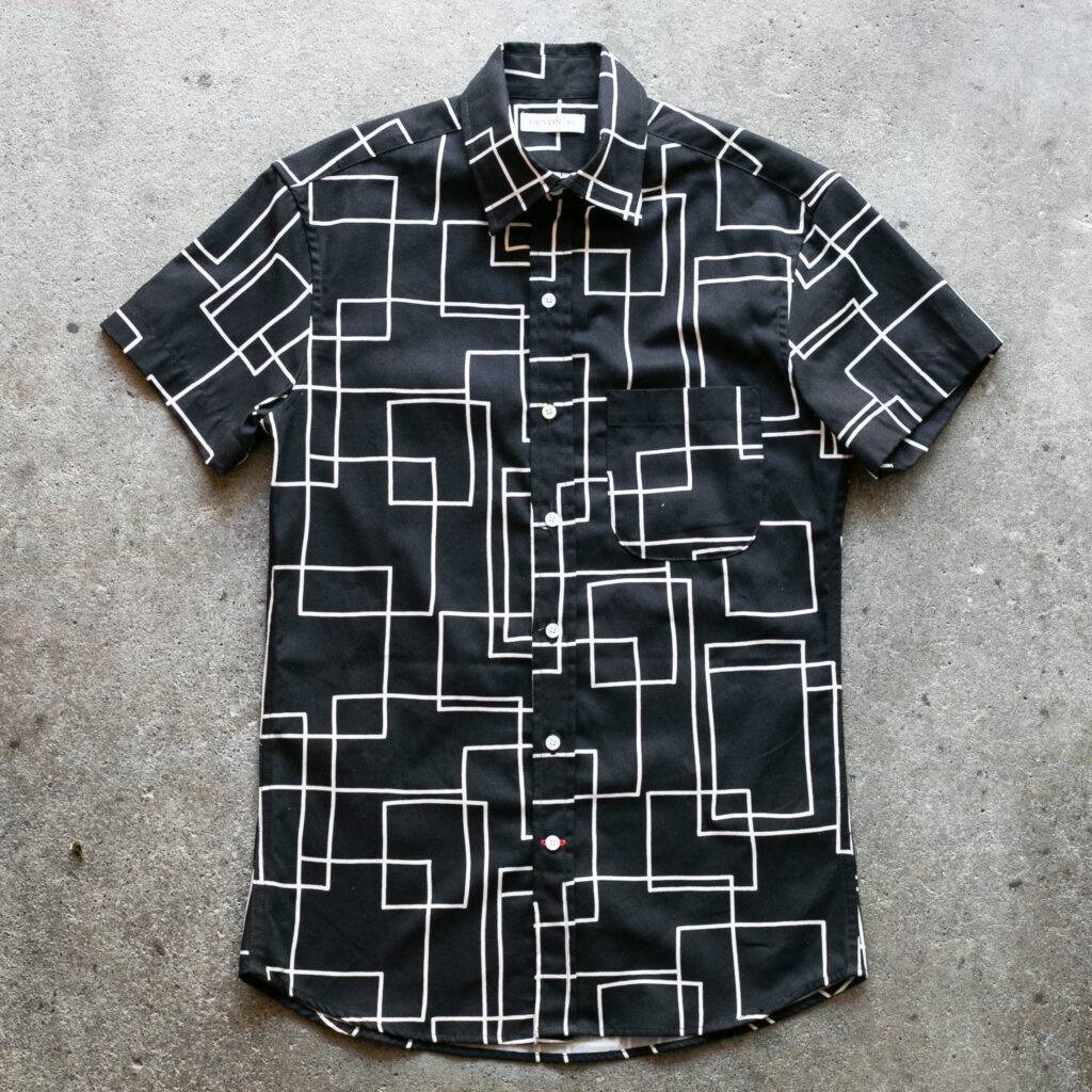 Earth tones contrasted by an abstract labyrinth print in stark contrasting colours. To us, it captures the perfect retro midcentury modern spirit. Gustin’s short-sleeve shirt is the perfect way to show of this character. Enjoy.