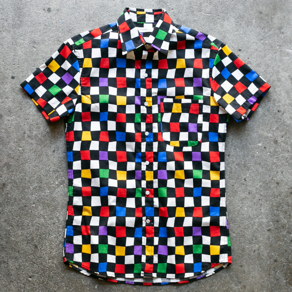 Not sure words can do better than the pictures in this case. On the wild side, yes, but this is what we love about the short sleeve shirt. It’s a chance to be a bit more expressive and we approve of this one. Checkers with a skew. Bold colors. Lots of contrast.