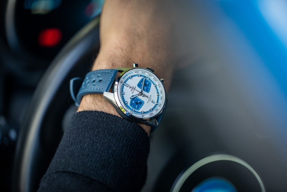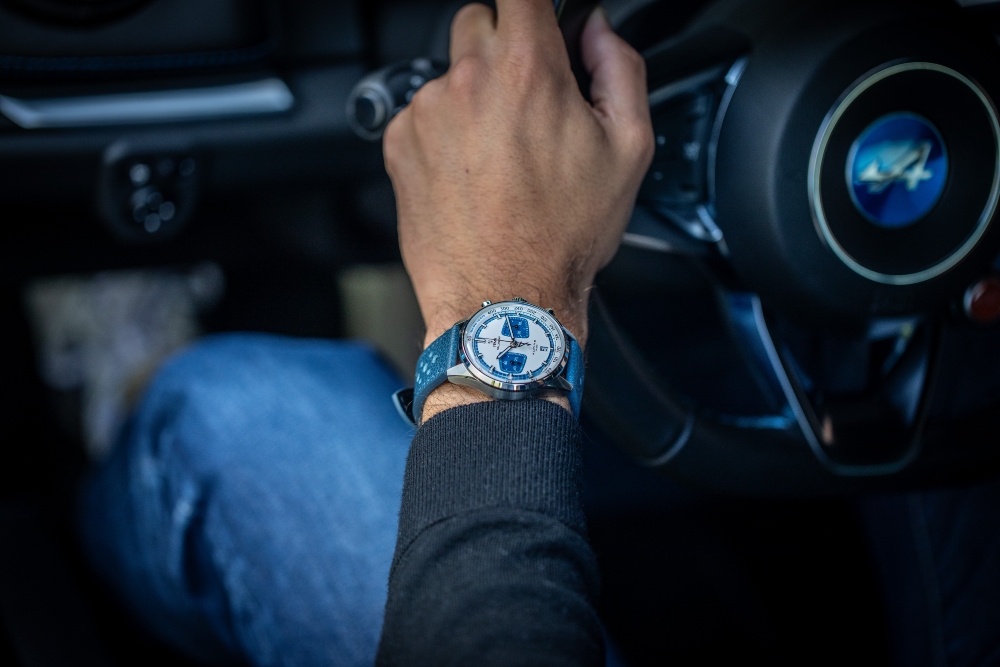 The pièce de résistance, however, is the stunning grained leather perforated strap, rendered in a vibrant Alpine blue that perfectly matches the dial. It’s a detail that captures the spirited essence of classic French racing and elevates this exclusive timepiece, priced at €2190, into the realm of instant classics.