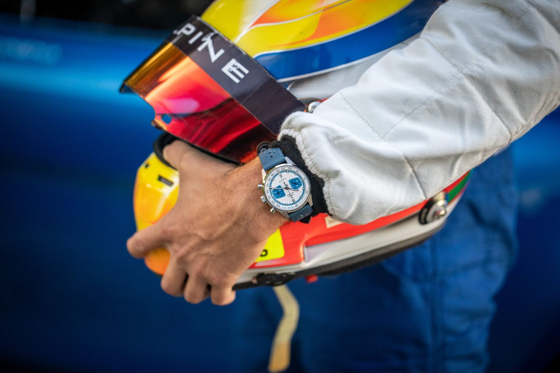 The pièce de résistance, however, is the stunning grained leather perforated strap, rendered in a vibrant Alpine blue that perfectly matches the dial. It’s a detail that captures the spirited essence of classic French racing and elevates this exclusive timepiece, priced at €2190, into the realm of instant classics.