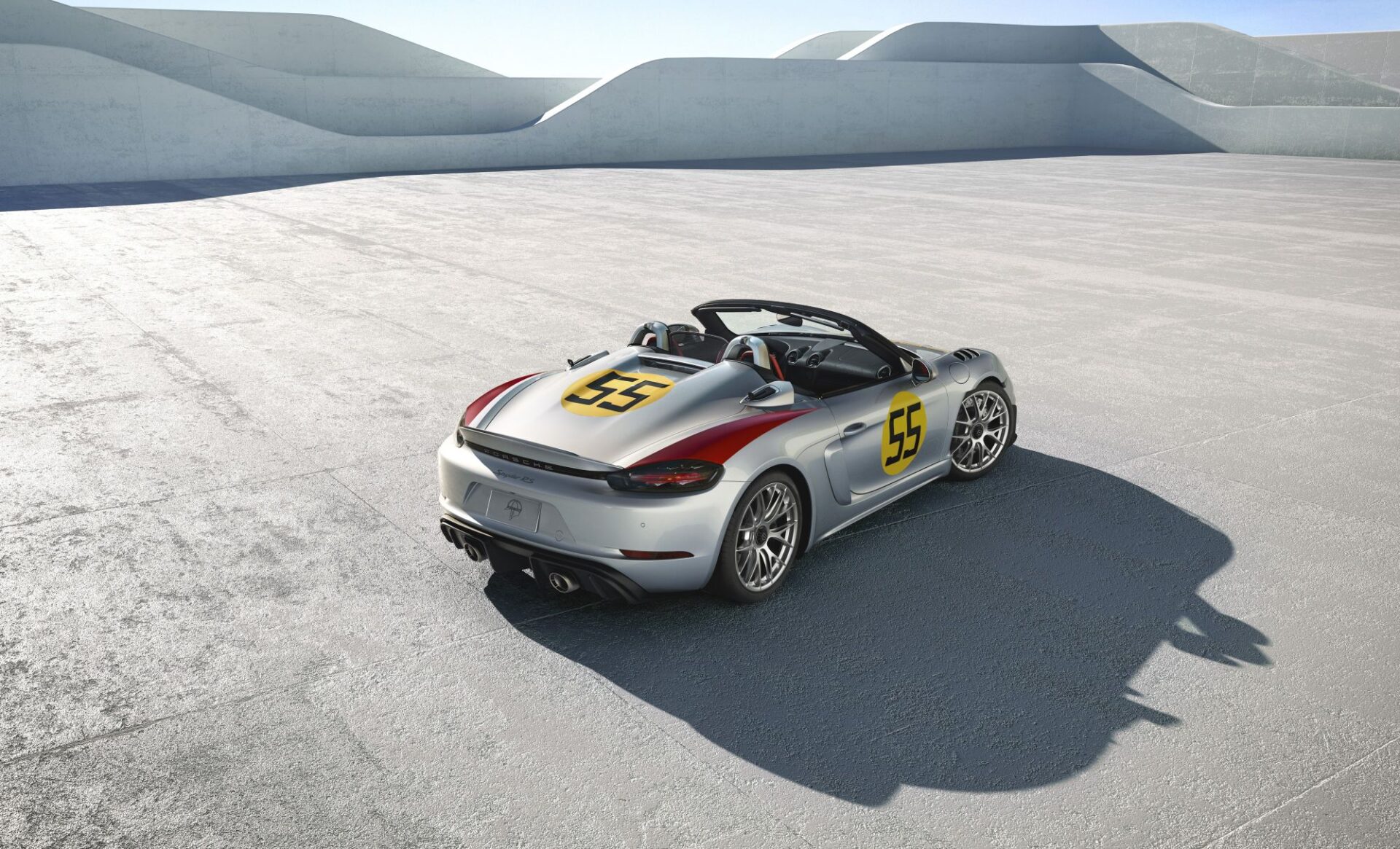 A beautiful nod to the past comes in the form of the number 55 roundels on the doors and rear of the car, matching Hans Herrmann’s iconic 550 Spyder that secured a class victory back in 1954.