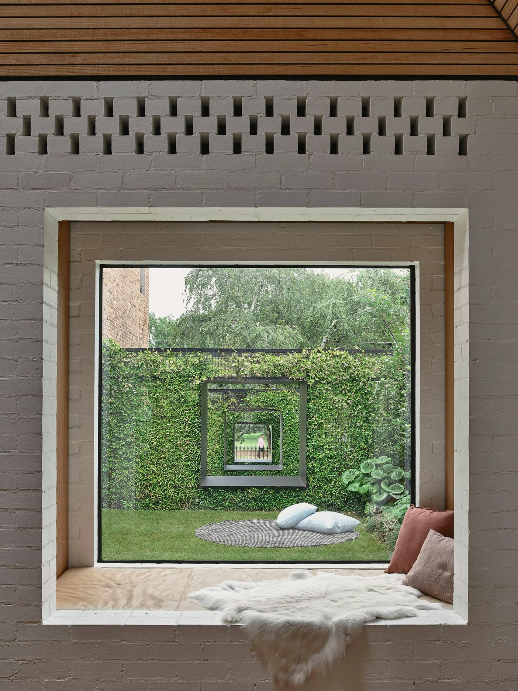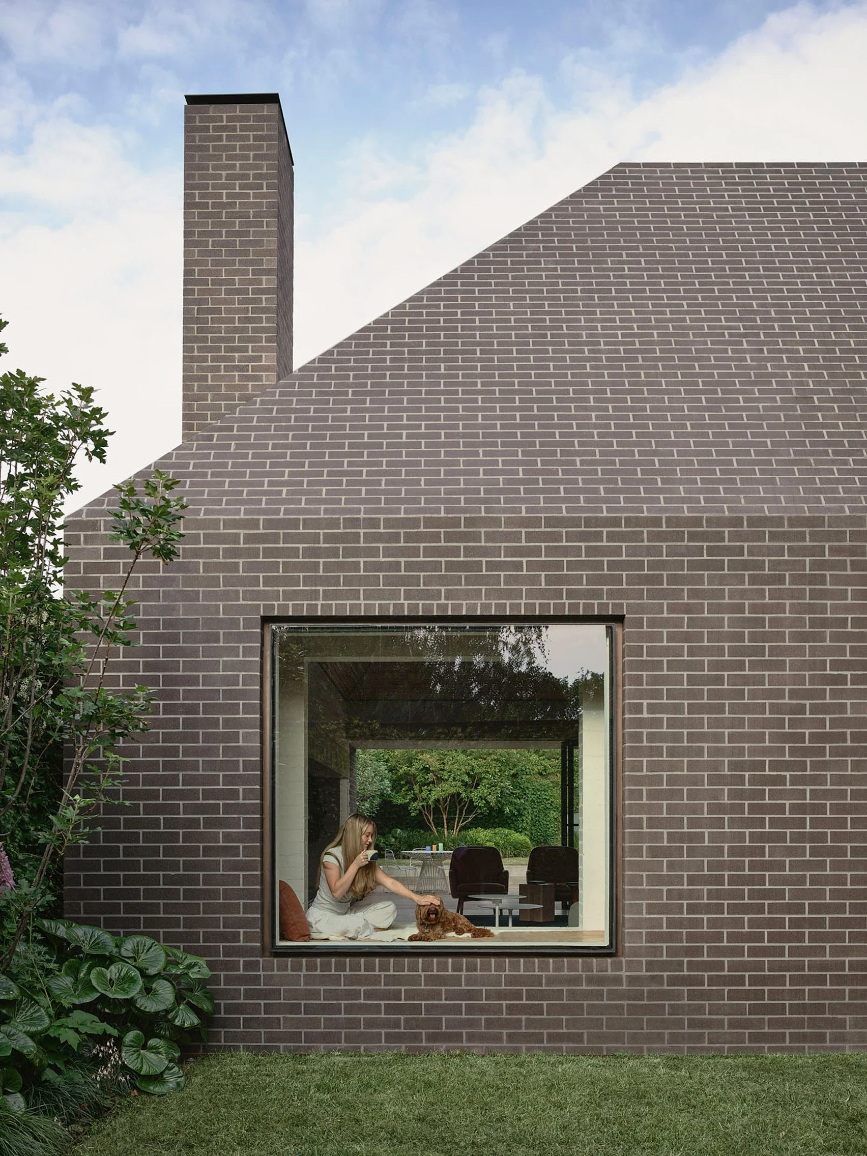 Then, there’s the second pavilion at the back of the property, which replaced a previous, less successful addition. This one is rendered in a pale, rough brickwork that offers a compelling contrast to the black brick of the other extension. It’s topped by an asymmetrical gable roof and punctuated by charming, narrow arched windows that give it an almost whimsical feel.