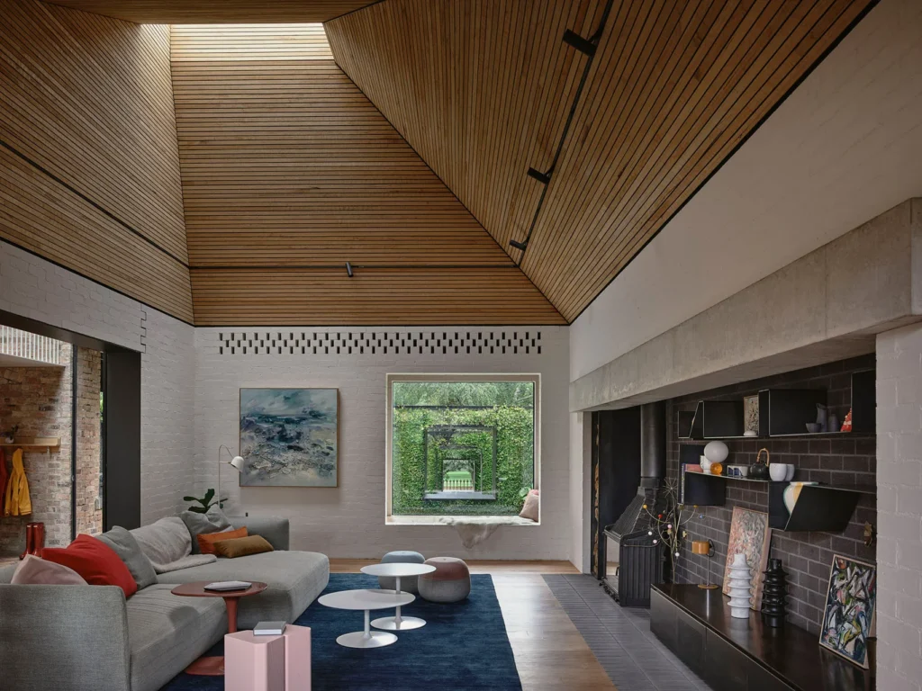 This pavilion houses a large family area that opens out onto a timber-decked terrace, creating a seamless blend of indoor and outdoor living. This extension isn’t just a random addition; it’s a direct and clever reference to the neighbouring Arts and Crafts home, featuring a steeply pitched, timber-lined roof with a central skylight and an exaggerated chimney that juts out from a cosy-looking wood burner. It’s a bold, contemporary statement that still feels deeply rooted in its surroundings.