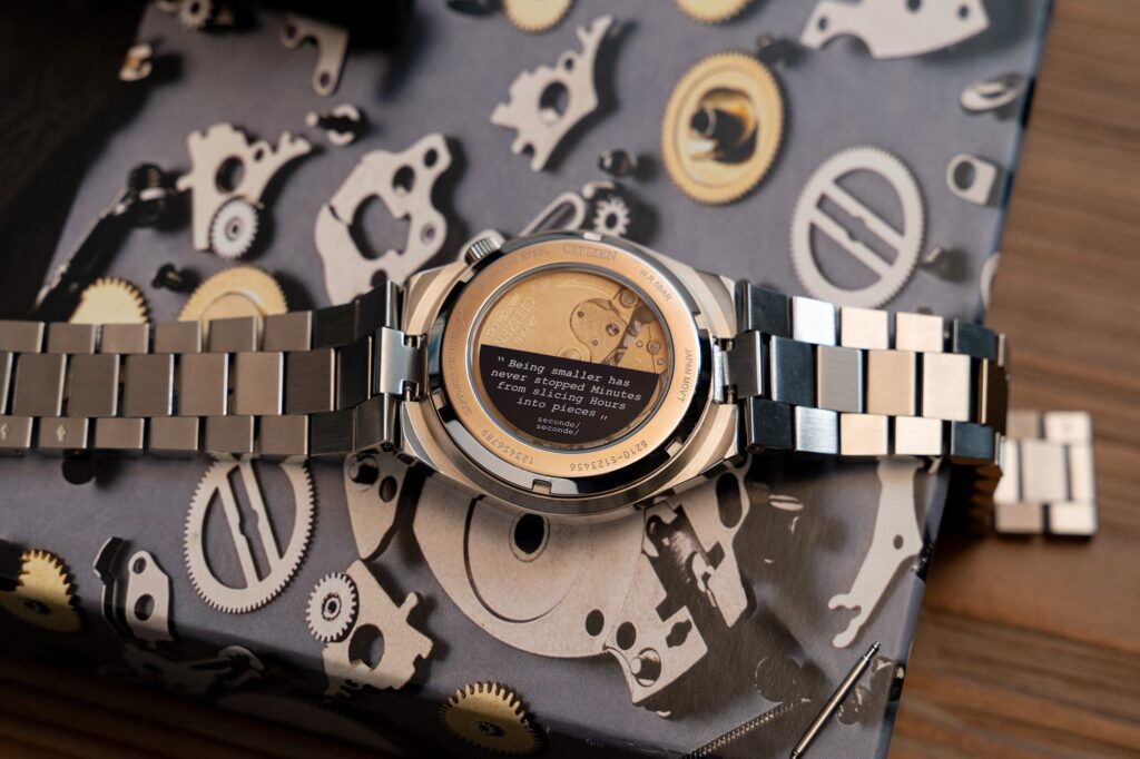 Beneath the playful exterior beats a heart of serious, reliable Japanese engineering. Visible through the exhibition case back is the Citizen Caliber 8210 automatic movement, a 21-jewel workhorse that delivers a solid 40-hour power reserve. However, even the case back has been treated as a secondary canvas by the artist.