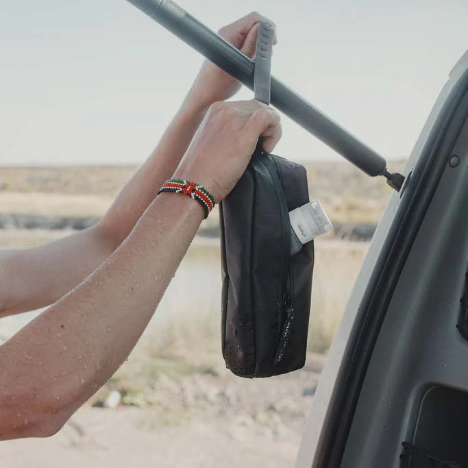 The clever design even features a built-in strap so you can hang it from a shower head, a towel rack, or even a tree branch, making it the perfect companion for any destination, no matter how remote.
