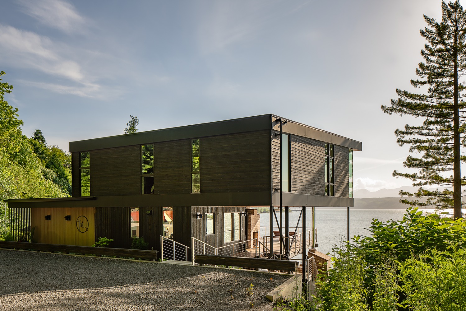With Aldo Beach House, there are two shifting wings which float over the hillside and beach. These are supported by thin steel columns and pin piles. Located on the eastern shore of Hood Canal near the Bangor submarine base, this stunning home includes the original two-bedroom structure for an expanded program of two new bedrooms, two bathrooms, and flex space. The design has three distinct parts: the original footprint, and the two projecting wings: the first a south ground floor addition, and the second an upper-level master suite to the north.