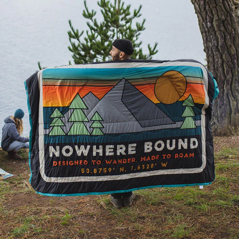 Crafted from 100% recycled plastic bottles and featuring serious warmth to weight ratio, our Nomadic Travel Blankets are an icon in the making. Packable and super versatile, they’re an essential for all the journeys to come. This one features our new ‘Nowhere Bound’ graphic, made for the roamers.