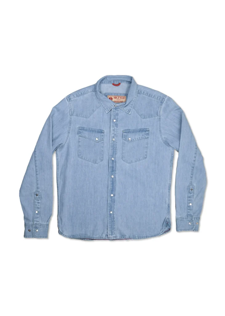 This mid-weight 9oz button-up features a stylish western-inspired design: pearl button snaps throughout, classic western-style shoulder and back yokes, symmetrically slanted front chest pockets, and a modern fit.