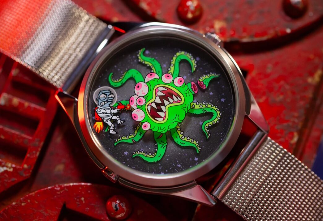 Instead, the position of the spaceman’s deadly ray gun points to the minutes, constantly shifting as he takes aim at his foe. The hour, in a wonderfully gruesome twist, is indicated by the monster’s own severed tentacle, a testament to the ferocity of the ongoing fight. It’s a playful, clever, and perfectly integrated system that elevates the watch from a simple accessory to an interactive piece of art.
