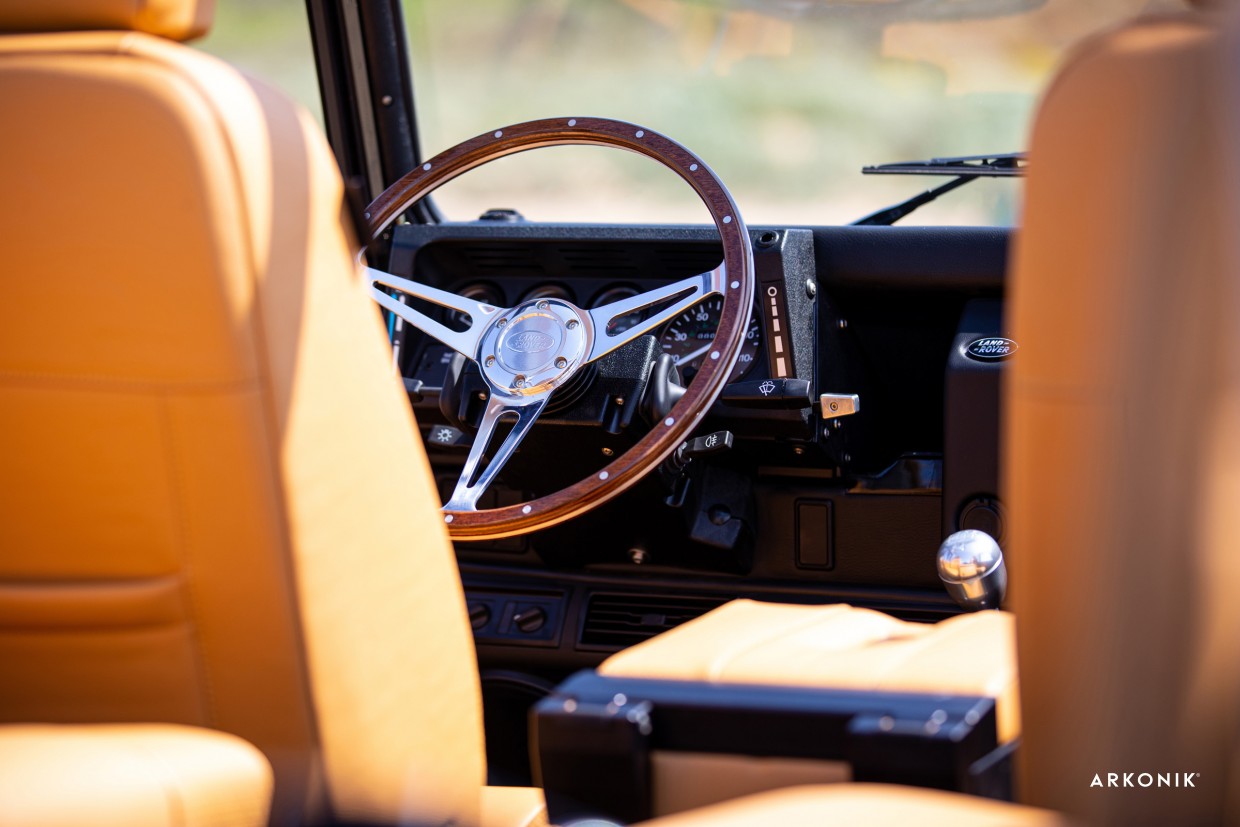 Boasting a highly classic look with its silver Heritage grille, bumper and frame to offset the gleaming Java Black paintwork, the So-Cal from Arkonik is a real sight to behold. The interiors positively excel with the Camden Woven interior trim and wood-rimmed steering wheel enhancing the surf vibes of this ultra-stylish D90. With the Tan soft-top removed, the interior is fully revealed for all to see. Puma style seats upfront and tip-seats in the rear have been trimmed in Camden Supersoft leather by Ruskin Design®, and include woven detailing throughout.