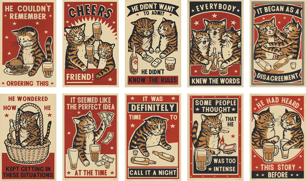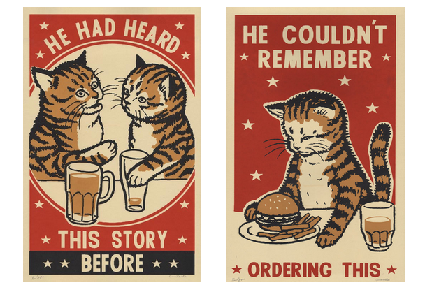 Whether you opt for the magnificent matchboxes or one (or likely more) of the Arna Miller Cat Prints, you’ll be getting a great piece of artwork relating to our favourite four legged friends. With a somewhat serious historical looking aesthetic and matter-of-fact text adding an air of propaganda style to proceedings, these ridiculous pieces of artwork do a great job of finding comedy in imagining animals undergoing the same human emotions, ambitions, and failures as we do day in, day out.