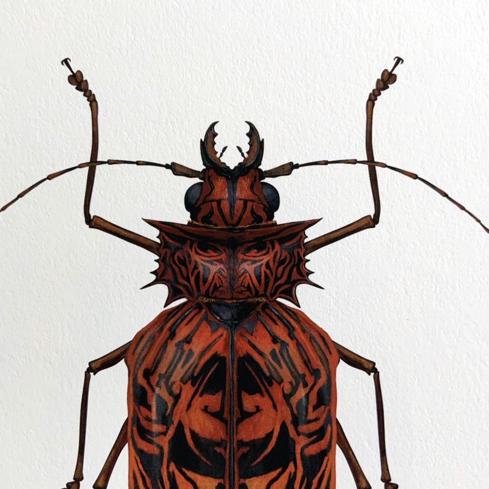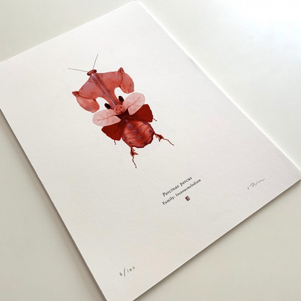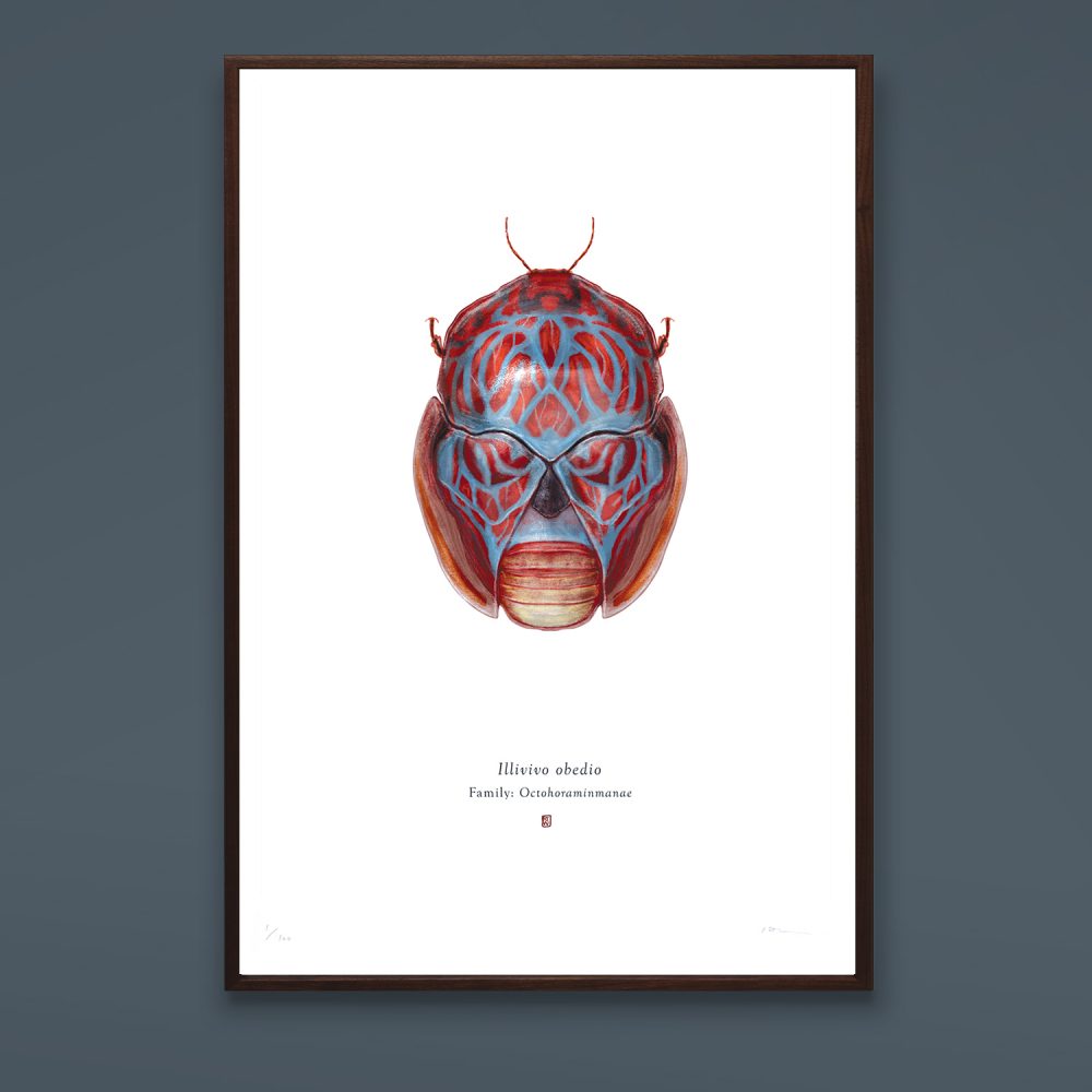 Wilkinson’s first series of artwork, this majestic looking Arthropoda Iconicus collection, is an extensive series of artworks illustrating imaginary insects (and a few other arthropods) which hold within them a resemblance to some specimen of popular culture – a film or TV character, a vehicle, a building, a shoe or a bag – and it’s great fun deciphering which member of the Star Wars galaxy or horror film franchise has been captured in his creation.
