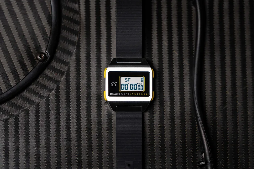 Boasting a chamfered sapphire crystal case that brilliantly reveals the understated and simple black and white LCD module with blue EL backlight that will take you back to the simpler times of an era when this basic tool was the proto-“smart watch.” If you’re a fan of vintage racing, this is definitely the watch for you.