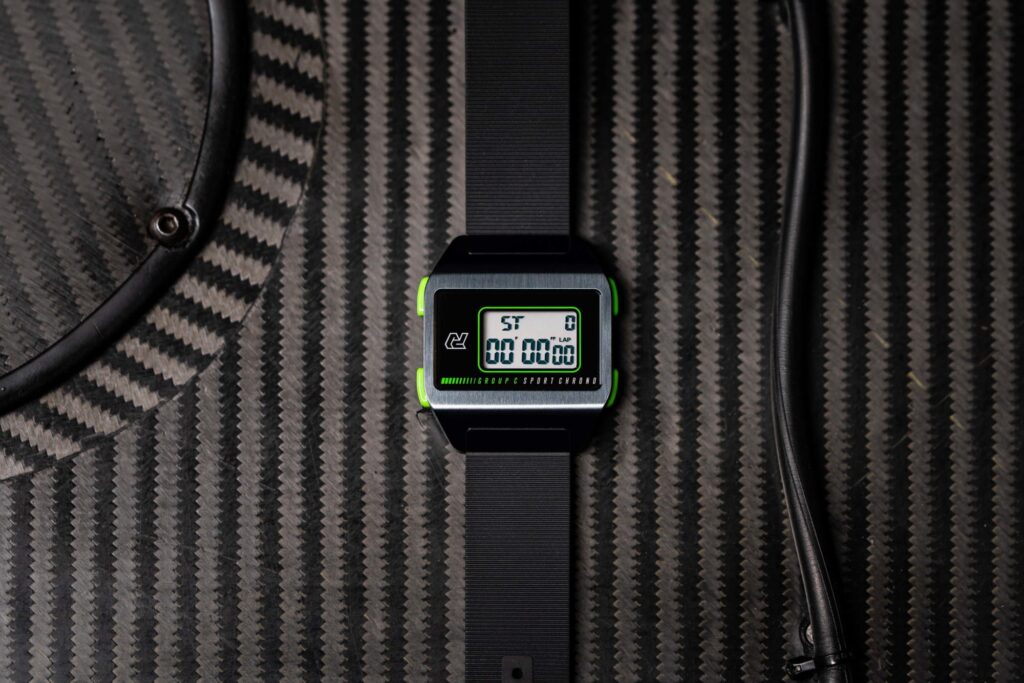Autodromo aims to celebrate the dawn of the Digital Age with their super-cool Group C Sport Chronograph Digital Watch. The clean, slab-sided shape of the case reflects the rational aerodynamic forms of cars such as the Porsche 962C and the Sauber C9. The vibrantly coloured pushers are a knowing nod to the fluorescent-hued mirrors of Group C cars that allowed them to be differentiated at a distance at races such as the Le Mans 24 Hours.