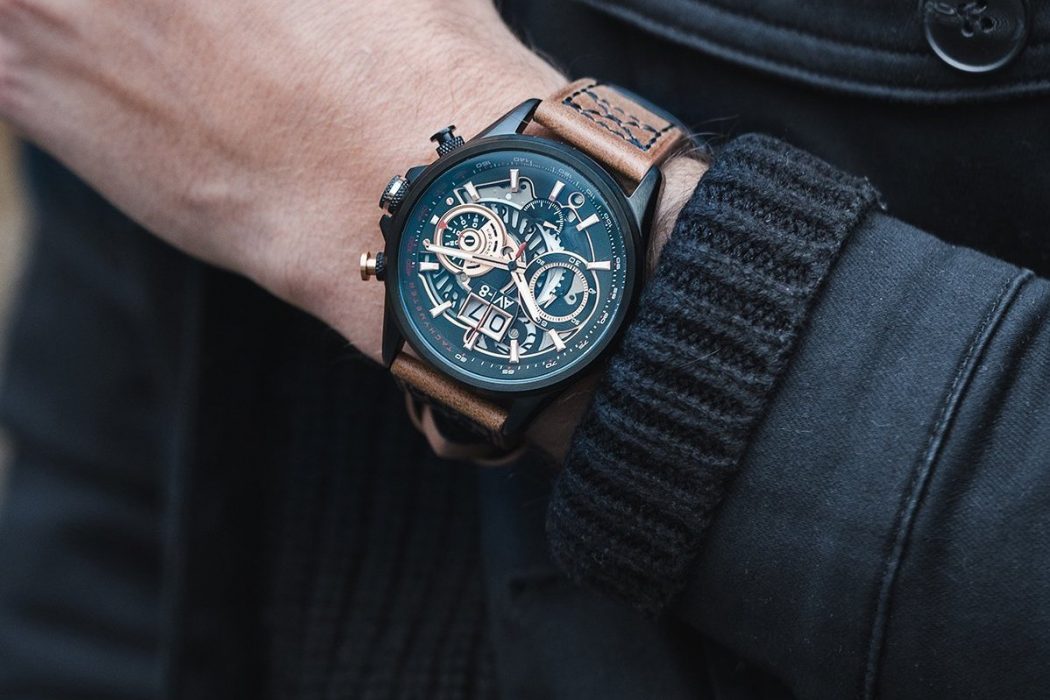 The AVI-8 Hawker Harrier Matador Watches (£275) are, at first glance, a complex jigsaw of gears and wheels, which are precisely positioned on top of one another as an innovatively designed piece of aviation-inspired timing instrumentation. The sturdy case measures 44mm in diameter with a carved caseback that is designed to reflect the turbine blades of the Rolls Royce Pegasus engine inside the Harrier.