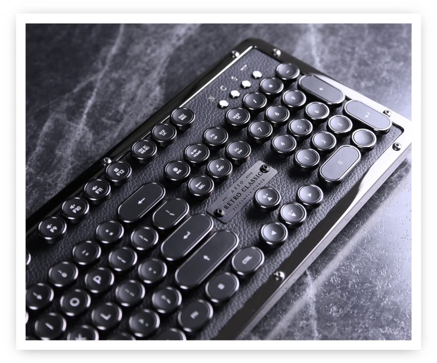 The Azio Retro Classic Keyboard is available in four distinctive styles – namely, Artisan (black leather with copper matte frame), Posh (white leather with copper matte frame), Onyx (black leather with black chromed frame) and Elwood (walnut wood with gunmetal matte frame) – so you’re sure to find the perfect iteration to fit in with the aesthetic of your own workspace. The use of leather and wood in the crafting of these keyboards really does add to their elegance and sophistication and they boast a tangible sense of quality.