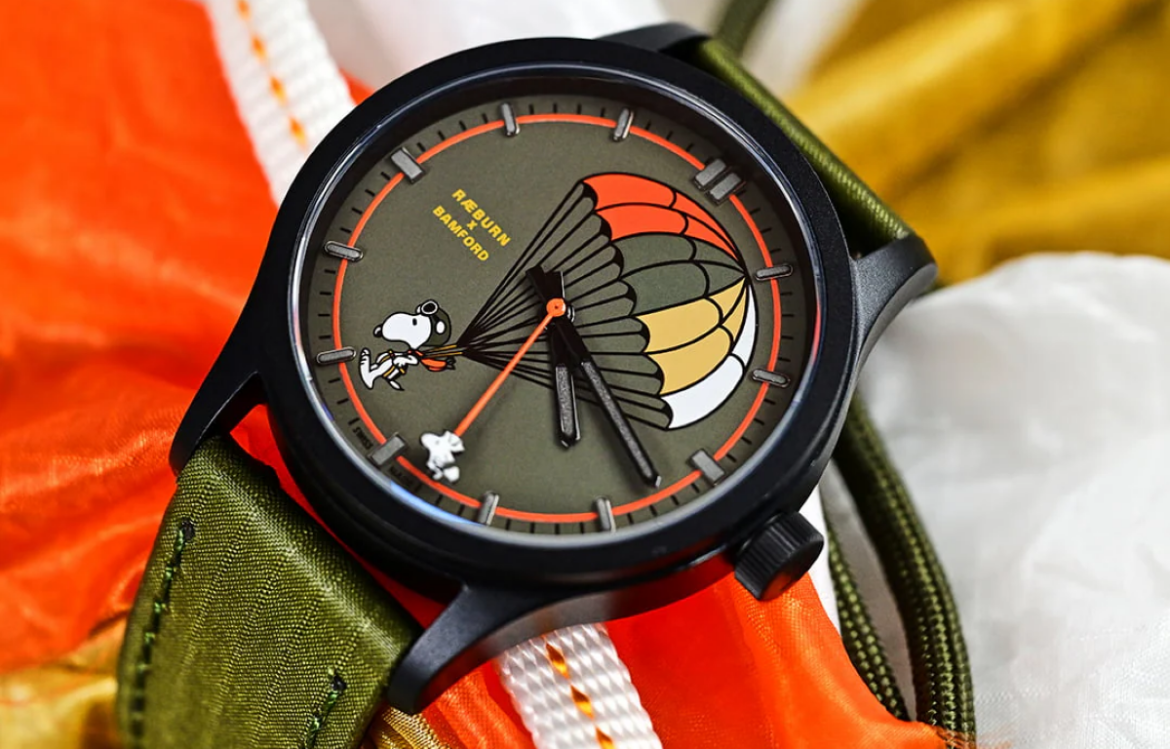 The Bamford x RÆBURN Snoopy B80 watch (£1350) exudes a captivating earthy colour palette, inspired by RÆBURN’s renowned parachute logo. The dial artwork is playful and nostalgic, featuring Snoopy gracefully descending to Earth with the aid of RÆBURN’s authentic pilot’s parachute. This whimsical design not only adds a touch of charm but also symbolizes the shared mission of Bamford and RÆBURN to champion responsible design and art.