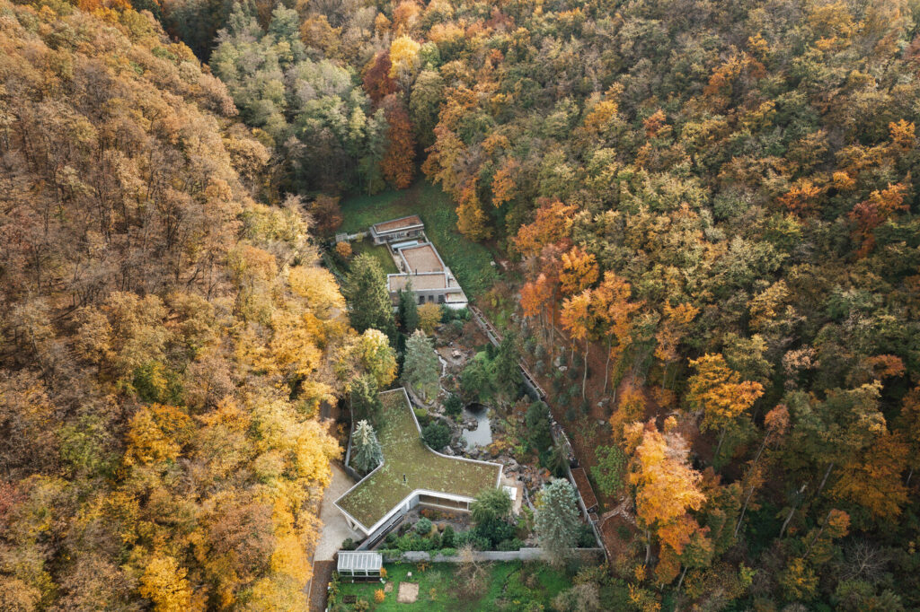 The very name, “Banánka,” a local term for a female resident of Banka, speaks to the house’s deep connection to its location, a peaceful enclave characterised by established gardens and the organic arrangement of neighbouring homes. Access is via a narrow asphalt road that gradually gives way to a forest path, hinting at the secluded haven that awaits. A stream traces the property’s edge, bordered by a dense deciduous forest that acts as both a natural privacy screen and a vibrant green backdrop. The valley, relatively narrow along the plot’s longer sides, sees the forest rise steeply into the hills, while on the shorter sides, neighbouring houses remain discreetly veiled by mature garden vegetation. This former garden plot offered a rare and precious advantage: deep privacy amidst a tapestry of mature trees and established greenery.
