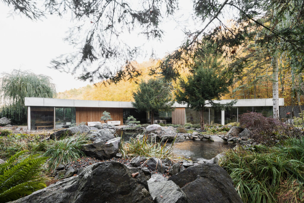 This connection isn’t a mere architectural flourish; it’s a way of life at Banánka. The sliding glass façade, seamlessly bridging the central living hall with the terrace and the garden area – complete with its own serene pond – is frequently drawn back throughout the extended summer months. This deliberate act allows the melancholic beauty of the rock garden, the gentle flow of the stream, the still surface of the pond, and the towering presence of the surrounding trees to permeate the interior, blurring the lines between the built and the natural.