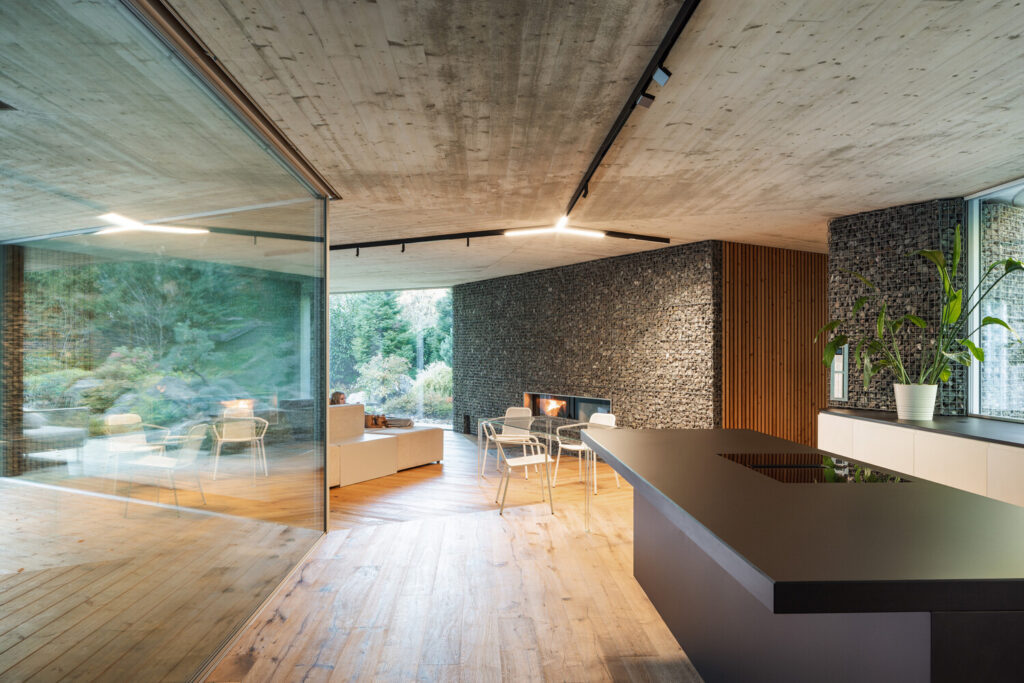 Enhancing the material concept, crushed stone encased in galvanised mesh gabions flows seamlessly from the exterior into the interior, creating a tactile and visually striking element. These are beautifully complemented by the warmth of wooden cladding, floors, and decking. The windows, framed with an almost imperceptible slimness, can be fully retracted into wall pockets, further maximising the visual and spatial dialogue with the outdoors. Even the doors are subtly integrated, hidden within cladding and plastered surfaces. Inside, the space is largely devoid of superfluous decoration, its character defined by bespoke, custom-built furniture, beds, and a modular sofa that offers adaptable configurations.