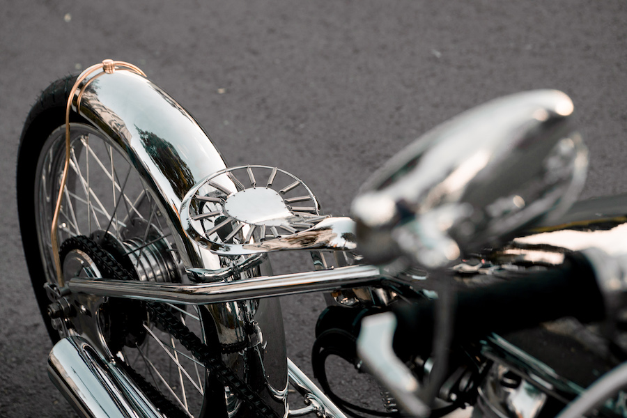 Positively chock full of stunning detail and excellent features, it’s not hard to see why this Merlin Motorbike from Bandit 9 has rapidly become one of the most sought after from the workshop to date. Just some of the more impressive features of this ride include a custom hardtail frame, a steel tank with mirrored finish, the stunning horological speedometer, custom handlebars and steel brakes and clutch levers.