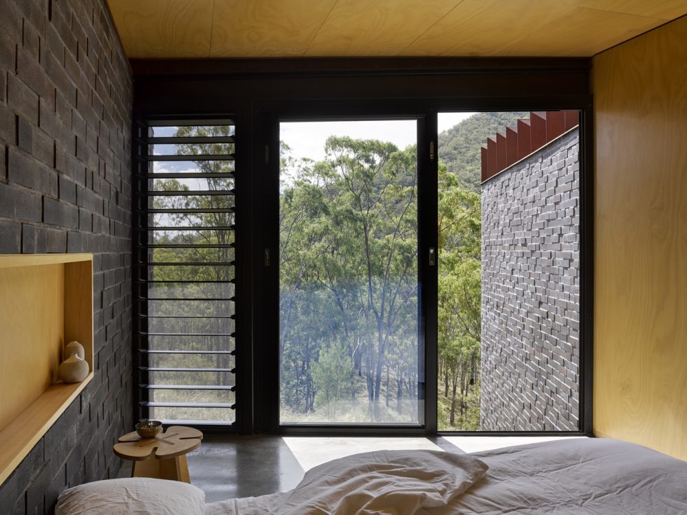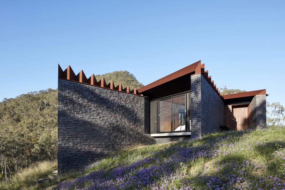 This weekend retreat gives the owners the opportunity to relax and unwind in some of Australia’s most mesmerising bushland and it has been so cleverly designed so as not to detract from its unique, wilderness setting. It boasts monolithic brick blade walls which are continued inside, and triangular roof pleats which penetrate the northern glass facade, with their patina resonating with the bark of surrounding gum trees.