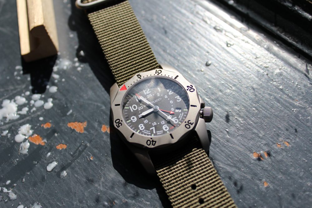 The Bertucci A-2TR GMT Vintage Watch is one of the most functional and versatile field watches from the brand to date and will be the perfect choice of timepiece for the adventurous amongst you. It comes with a solid titanium unidirectional rotating ring which can be used for measuring elapsed time: For simple quick method to measure up to 60 minutes… rotate the red triangle (the 0 minute marker) counter clockwise to align with the minute hand. As the minute hand moves as time passes, the time elapsed is shown on the outer ring minute markings where the minute hand has moved to.