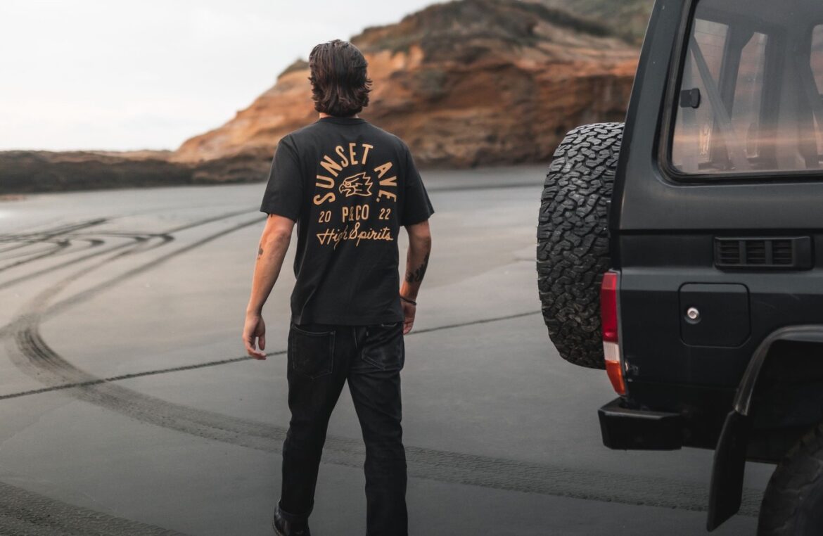The Sunset Avenue T-shirt in washed black from P & Co is a relaxed fit men’s graphic t-shirt made from a mid-weight 100% soft cotton jersey. The classic crewneck features hand-drawn artwork on the reverse & a small graphic print on the front.
