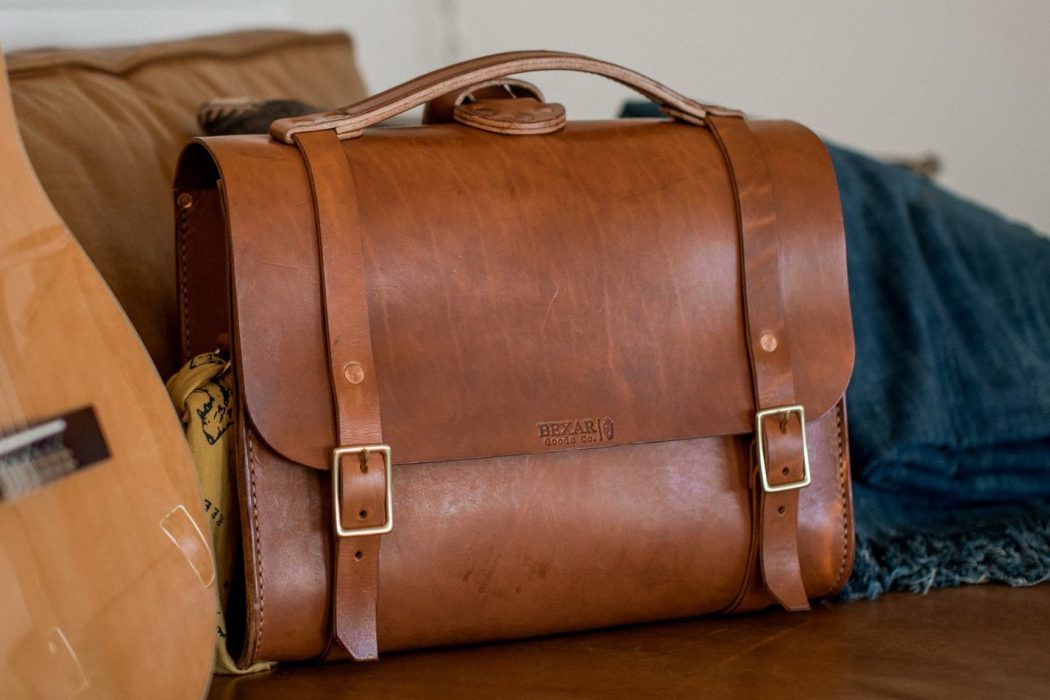 The Porter Satchel from Bexar Goods Co also boasts a hand-stitched construction and solid brass hardware – including the buckles, D-rings, and single large O-ring. Bexar Goods Co chose copper rivets because of the metal’s strength and unique weathering characteristics. Each copper rivet is hand set and peened over our anvil for a nice rounded finish and adds a real touch of class to the finished accessory.