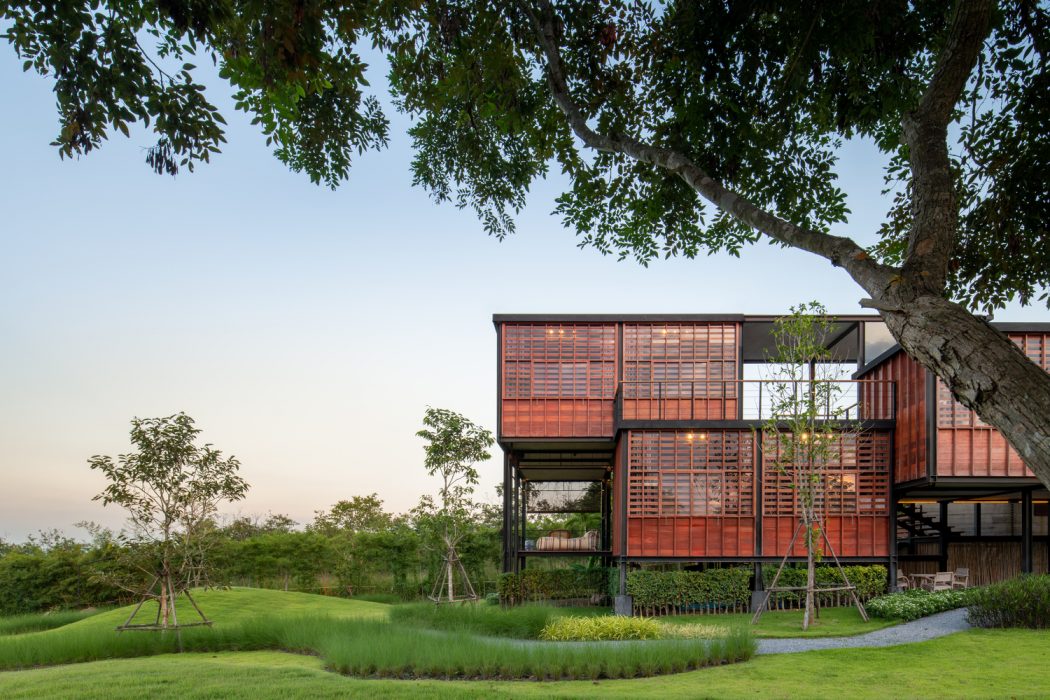 The wood of the Binary Wood House is one of the project’s green endeavours. Trees are regrown and wood is produced as environmentally consciously as possible. 80% of wood used to construct this stunning property comprises different types of reused wood which were re-polished, categorised, and assigned to suit different functions in the house. This was inspired by the traditional and unique “Korat House”, originating in Nakorn Ratchasima province of Thailand and the woodwork was carried out by the local craftsmen, whose expertise was utilised and adapted to meet the demands of the modern construction and design.