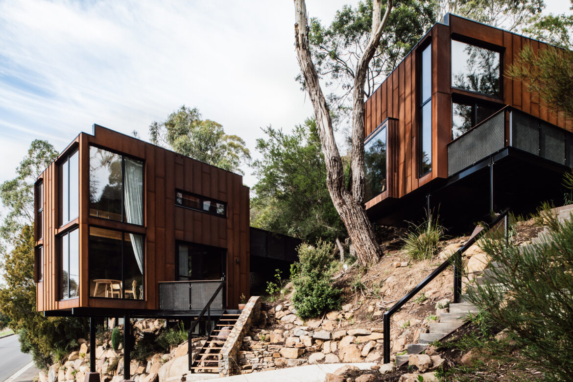 Birdhouse Studios can be found on a steeply sloping ridgeline site in Launceston, Tasmania, and the visually impactful buildings have expansive views to the East over the city and to the mountains that stretch out beyond. Each studio is a unique design that directly reflects the parameters of its plot. Some of the main design constraints for this build included limited site access, a 30-degree rocky slope, and the existing protected dry sclerophyll eucalyptus vegetation which needed to be preserved.