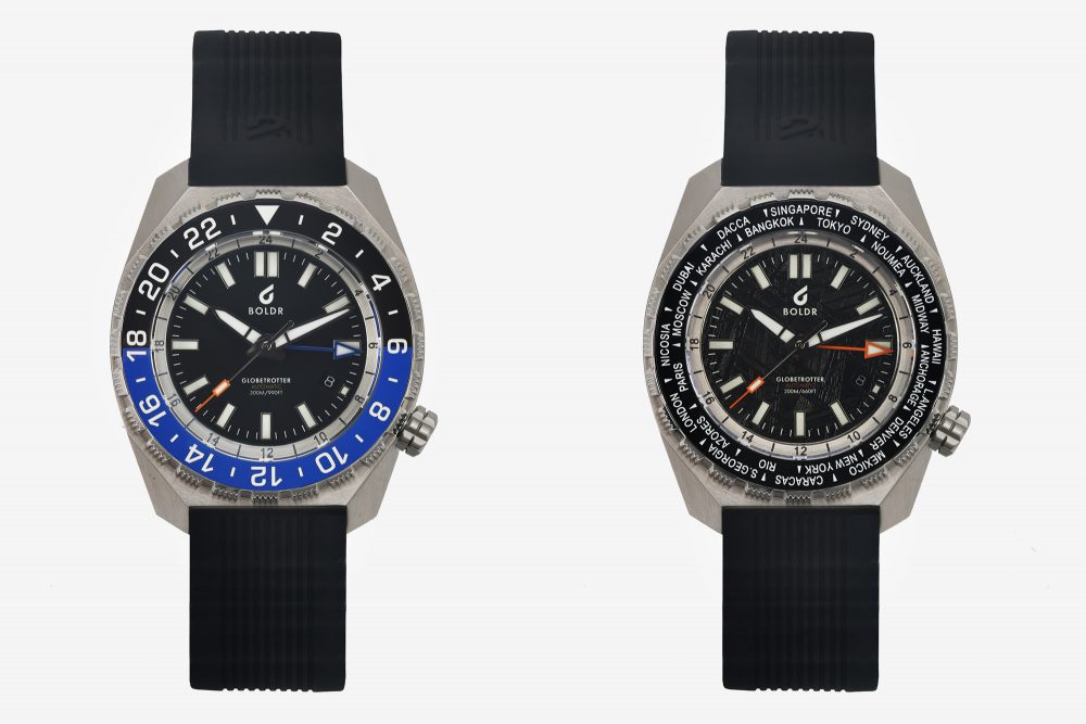 There are, at present, four versions of the BOLDR Globetrotter GMT available to choose from so you’re sure to find the ideal one for your wrist. This includes a classic Pepsi-style blue/red, a striking black/bright blue, and two further options with meteorite dials which complete the Globetrotter line-up of watches. Both of the standard models features a matte black dial with applied rectangular indices which have been treated with Super-LumiNova BGW9 lume that ensures it remains legible underwater and at night.