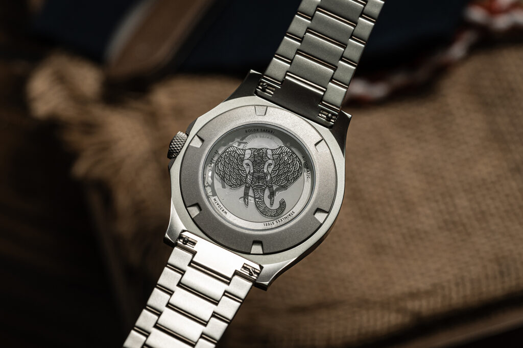 Every detail of this watch is carefully considered, right down to the convex grooves on the screw-down crown, which provides a secure grip while adjusting the time. The sapphire exhibition case back reveals one of four random safari animals etched into the back, serving as a reminder to conserve the natural world that inspired the creation of this timepiece.