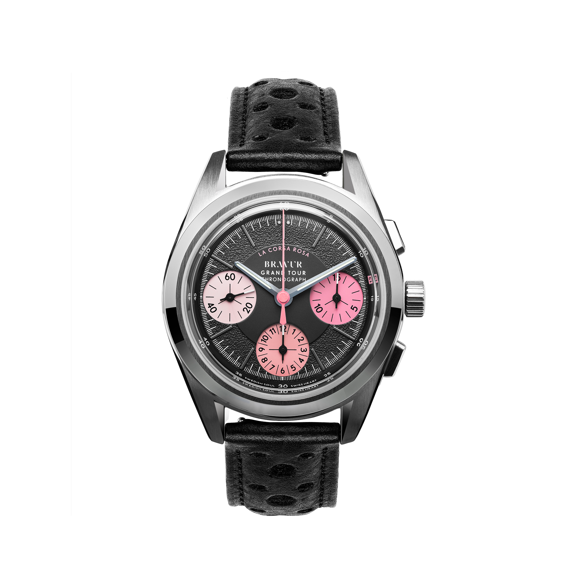 The Grand Tour – La Corsa Rosa model has a case diameter of 38,2 mm, which is a striking and versatile size. The case is crafted from 316L stainless steel and combines brushed and polished surfaces, delivering a balanced and sophisticated aesthetic. The timepiece boasts three sub dials with a 15 minute counter, ideally suited for timing those intervals, a 12 hour counter, which should be enough to keep track of your riding time, and lastly running seconds. The main second hand in the centre of the dial is a 60 second chronograph. The watch is powered by a Swiss made Sellita SW511 movement, with automatic winding.