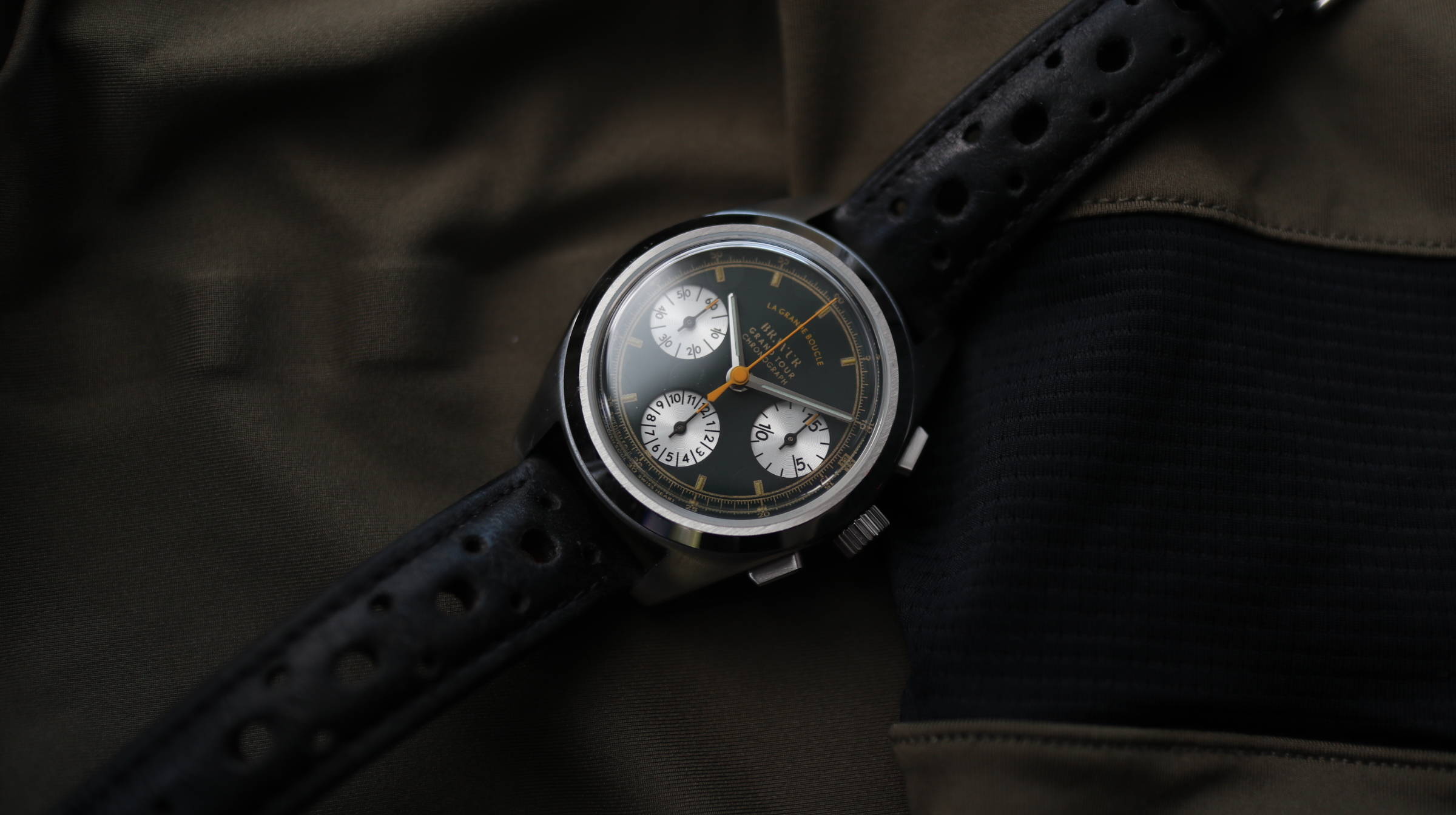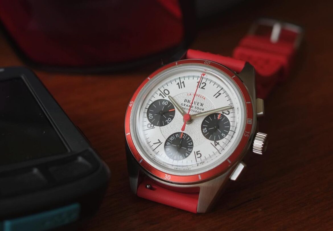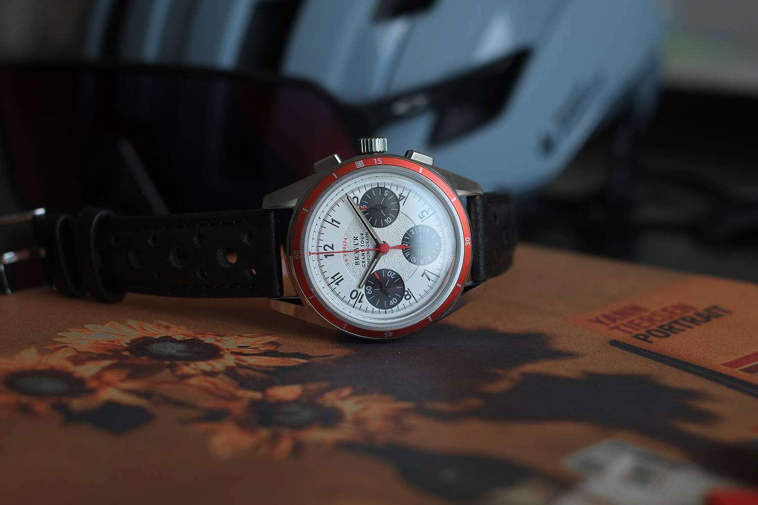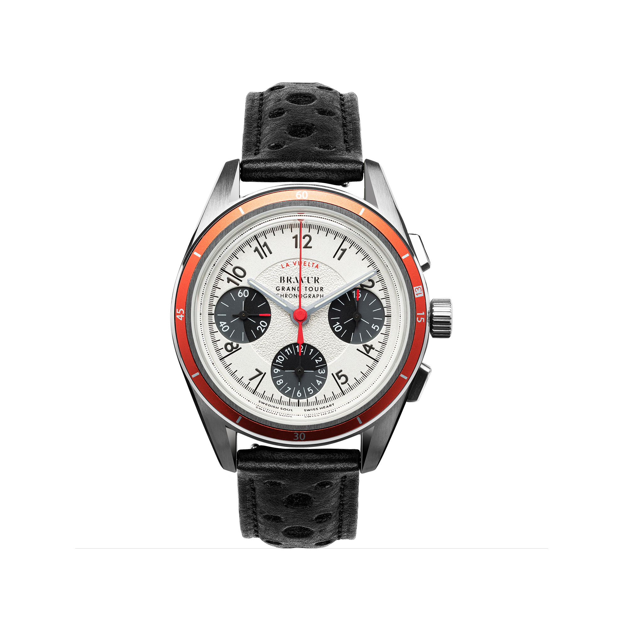 The La Vuelta from Bravur’s Grand Tour series is dominated by a red accent, which takes its aesthetic inspiration from the leader’s jersey in the Vuelta a España. The red colour really pops nicely against the silver white panda dial of this devilishly dapper timepiece. At 12 o’clock you’ll find a red “la flamme rouge”, the red triangular flag marking the last kilometre of a race. The centre of the dial boasts a tarmac pattern, and discreet darker grey areas on the sub dials completes the textured circle. A really classy looking timepiece that we’re loving here at The Coolector.