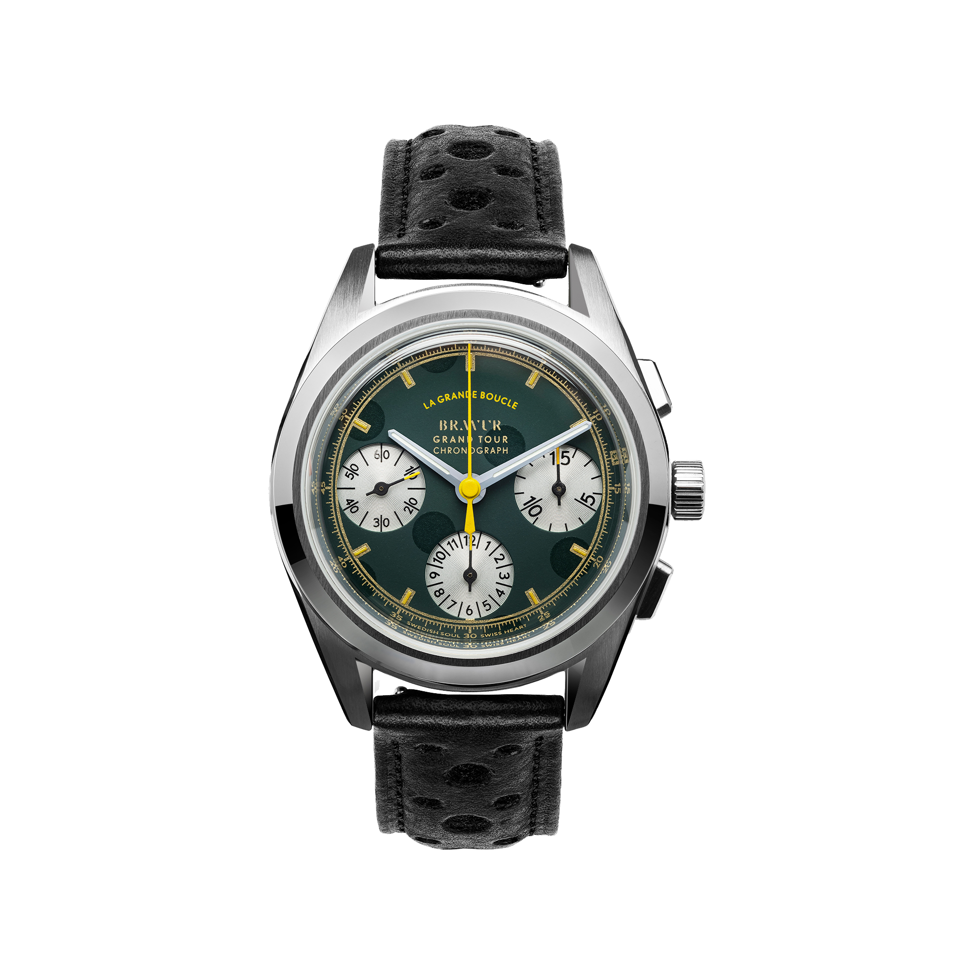 This stunning timepiece feature several design elements from the Tour de France and the world of cycling which really makes it stand out from the crowd. One of the most obvious is the yellow accents used on the big second hand and the sub dial hands. The yellow colour, which is associated with Tour de France and the leader’s jersey, has its origin from newspaper L’Auto, that founded the race and was printed on yellow paper. The watch is powered by a Swiss made Sellita SW511 movement, with automatic winding and only 50 watches will be produced of this model, each numbered on the case back. The perforated leather strap gives the watch a sporty but stylish look, adding an extra vintage vibe to proceedings.