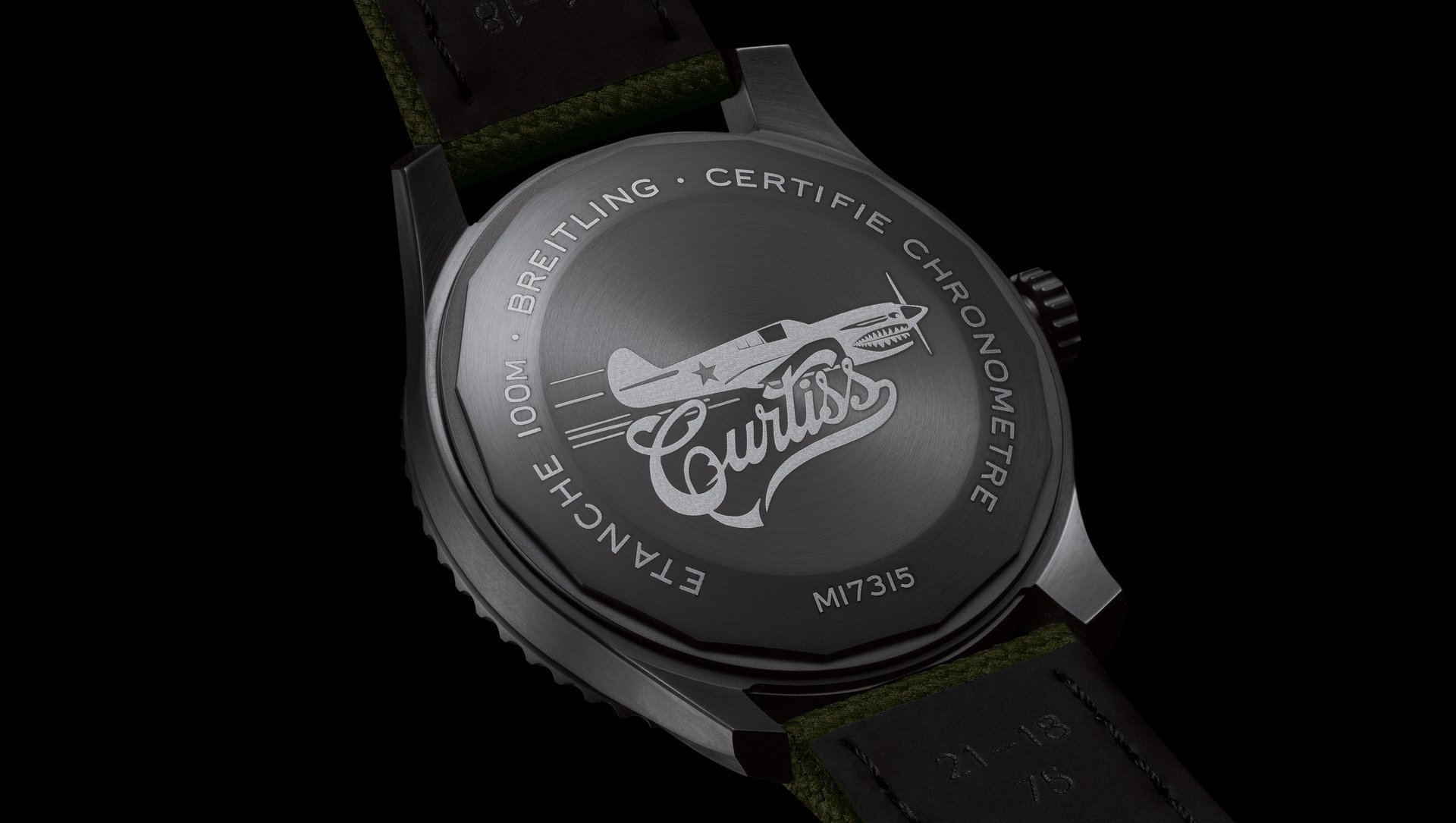 One of the most noticeable things about the design of these Breitling Curtiss -P40 Warhawk Watches is the eye-catching caseback which boasts a transparent sapphire crystal printed with a Curtiss inscription and an image of an airborne P-40 Warhawk, whose design, with its shark’s mouth and colour scheme, takes inspiration from the iconic paint job associated with the plane when it was piloted by the American Volunteer Group in the Chinese Air Force’s famed Flying Tigers unit.