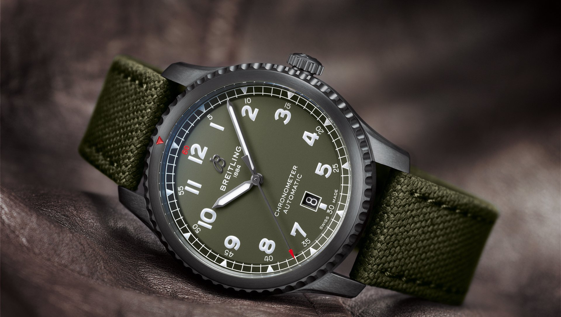 The stand out watch in this new collection from Breitling is the Aviator 8 B01 Chronograph 43 Curtiss Warhawk which is made instantly distinguishable by its military green dial with a striking matte finish. The contrasting silver subdials – 12-hour and 30-minute chronograph counters and a small second subdial – showcase that the watch is driven by the Breitling Manufacture Caliber 01, which is the Swiss watchmaker’s in-house mechanical movement, which is responsible for a remarkable power reserve of approximately 70 hours.