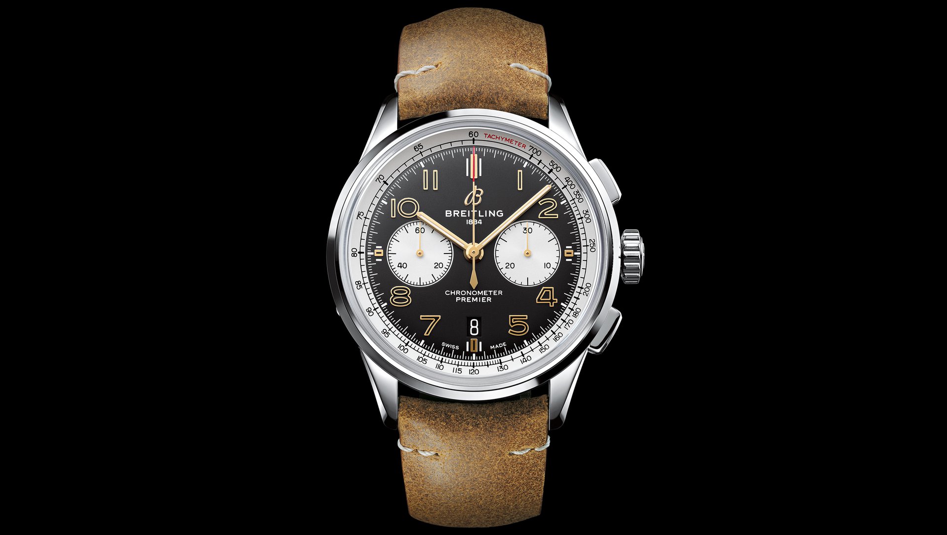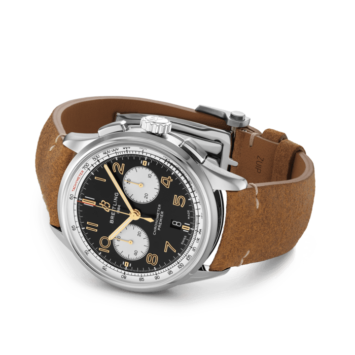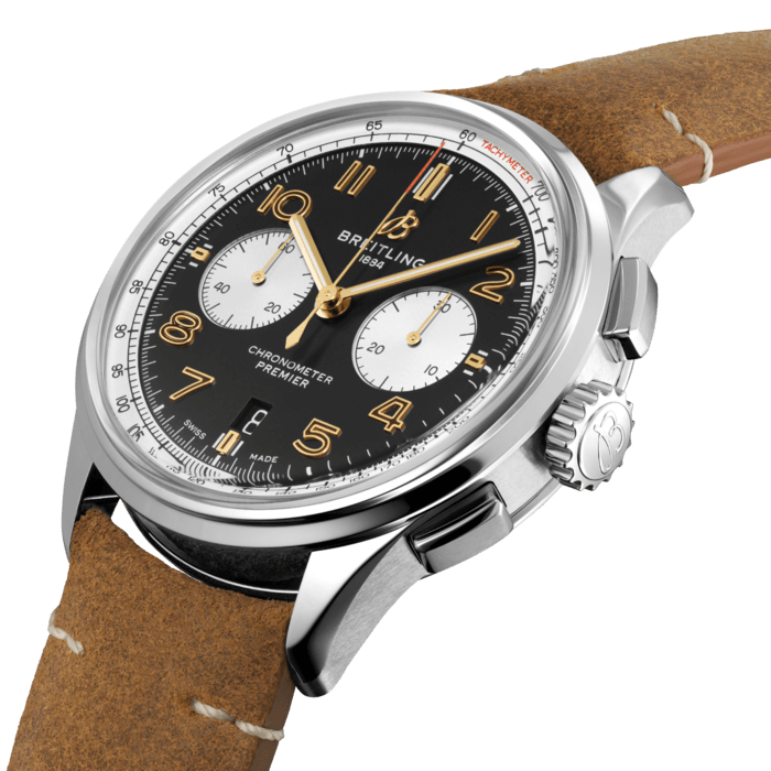 It boasts an elegant black dial with golden numerals and hour and minute hands that deliver an intriguing contrast to the brown vintage raw-leather strap that will appeal both to watch aficionados and serious motorcyclist enthusiasts. The model is also available with a stylish stainless-steel bracelet. The silver subdials – a chronograph minute counter at 3 o’clock and a small seconds subdial at 9 o’clock – agains the black dial Breitling Manufacture Caliber 01 at the heart of this watch, which delivers an impressive power reserve of approximately 70 hours.