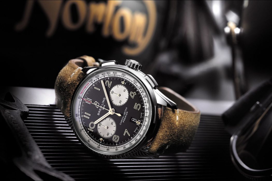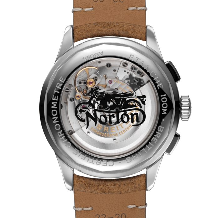 A spectacular addition to the Swiss watchmaker’s line up of collaborations, the Breitling Premier B01 Chronograph 42 Norton Edition reflects the cultures and values of these two world famous brands. It has a 42-millimeter stainless-steel case, water-resistance to 10 bar (100 meters) and a distinctive “Norton” logo can be found engraved on a plate on the left side of the case, and the transparent case-back boasted a printed Norton motorcycle and logo.