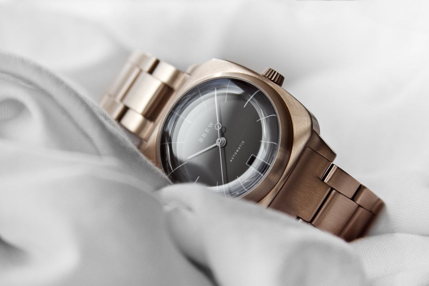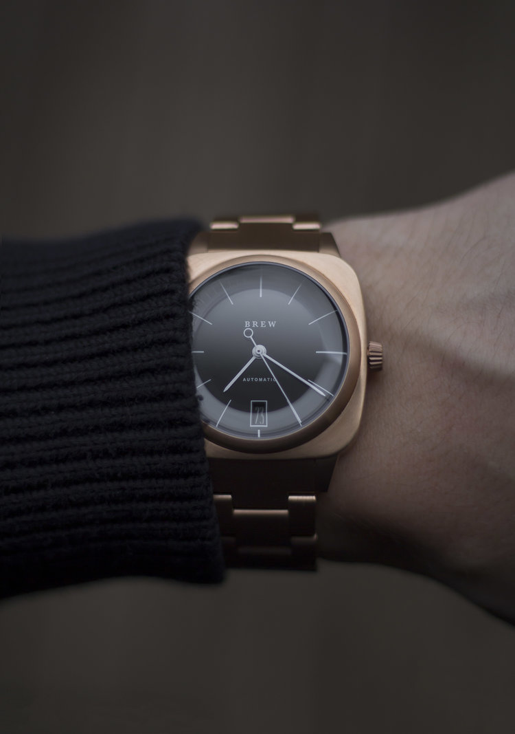 There is a distinct retro style feel to the HP1 Watch from Brew Watch Co and it has second and minute hands which follow the same contour as the dome dial ever so slightly. In addition to this, the dial has even more muted details that make the wearer look closer whenever they glance at the time. Etched minute markers run from 10H-12H and resemble the “high pressure region” which has taken its design inspiration from industrial espresso machines.
