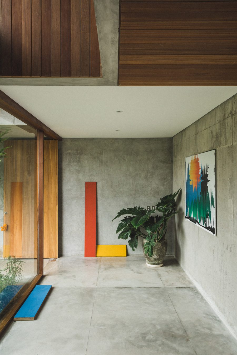 The Brutalist Tropical Home in Bali also has its own music studio, two bathrooms and one outdoor shower, alongside three bedrooms that are connected by a bridge over the living room. The exterior of the property is brought to life by exposed concrete which has been coupled with wooden detailing, with the interior of the house designed to act as a “blank canvas” for a mix of textured, colourful objects and furniture that fill the space – informed by the work of Clifford Still, Ellsworth Kelly and also the Bauhaus movement.
