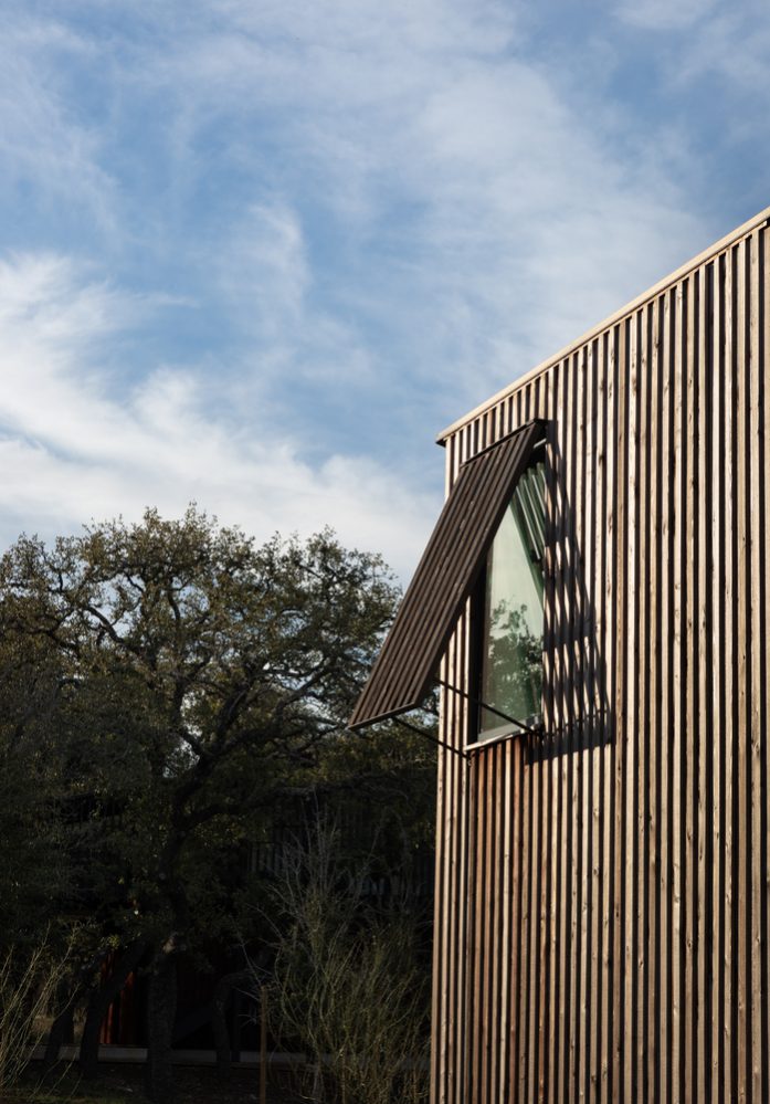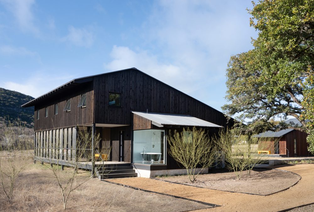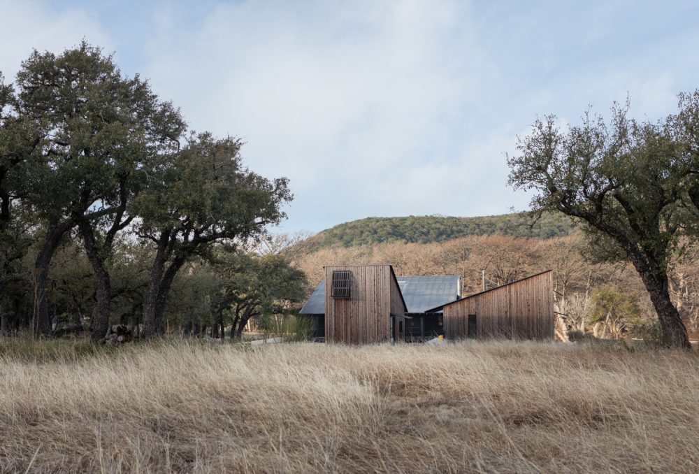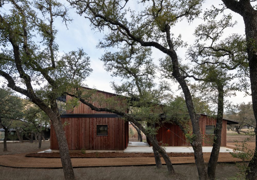 The main house and cottages of the Camp Frio Retreat are linked by a slightly elevated walkway which lets any barefoot kids to run back and forth over the tall grass and the bugs and creepy crawlies found within. Much in the same manner as “Dogtrot” shelters from the past, a “breezeway” bookended by concealed multi-slide doors, bisects the main part of the house and allows for alfresco dining most of the year. Alternatively, the space is zoned and can be enclosed for heating with screened porches, front and back, enveloping the cozy living spaces of the property.