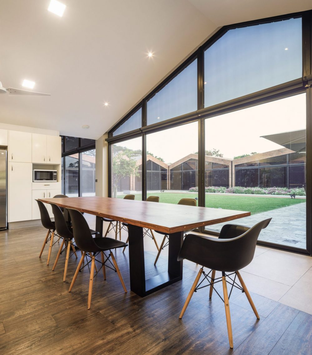 Each residential volume of the Casa El Cortijo is joined together in four different sections which create a square that surrounds a vast grassy courtyard, patio and swimming pool. Glass walls with gabled tops front each the volumes to offer views into this outdoor space and the patio joins together all of the spaces from an aesthetic point of view and makes sure that the house has a landscape of its own to enjoy.