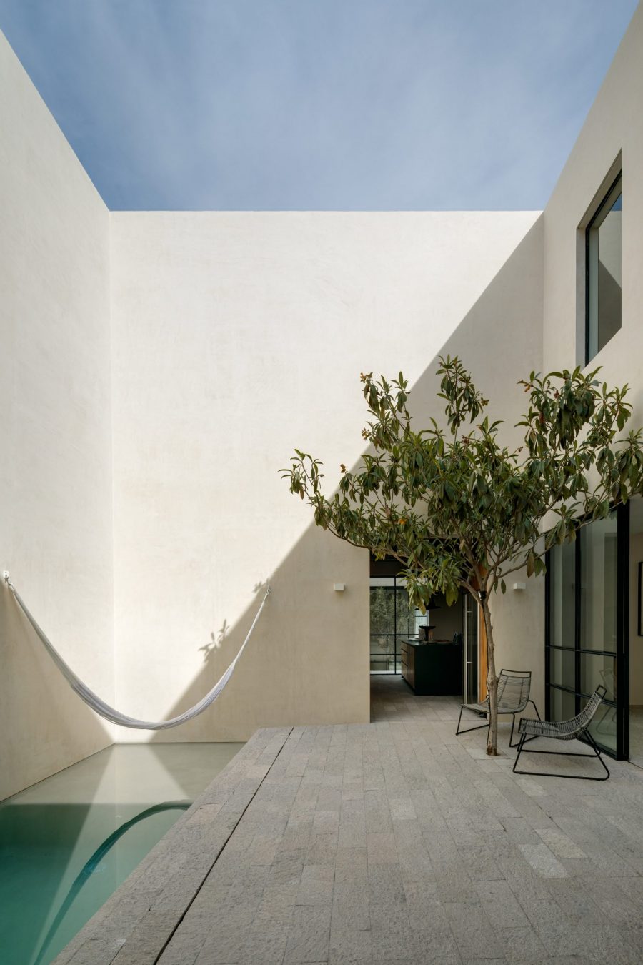 In order to overcome the fact that Casa La Quinta was surrounded by neighbouring properties, the architects, Pérez Palacios and Alfonso de la Concha Rojas, arranged the 350-square-metre house around three separate courtyards which was carefully designed in order to provide the residents with access to a private and relaxing outdoor space where they could head when they wanted to relax and unwind. The swimming pool and hammock are situated in the largest of the three courtyards and located in the centre of the property.