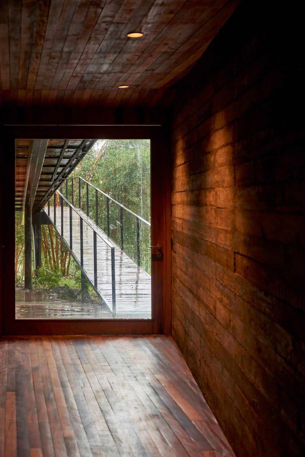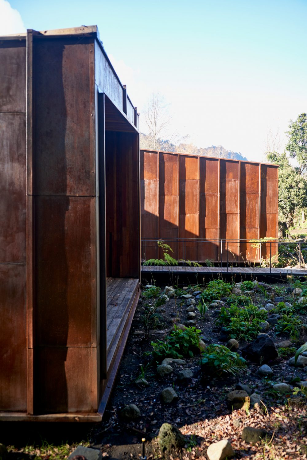There is a minimalistic, understated aesthetic to the interiors of Casa Lluvia that we’re big fans of here at Coolector HQ and they are lined with native woods, recycled from old sheds and local houses, which had been dismantled due to their poor condition, or because a new building has been put in their place. The use of these recycled native woods, such as oak, rauli, coihue and laurel, ensures that the house has a reddish tonality that interacts superbly with the rust of the steel structure.