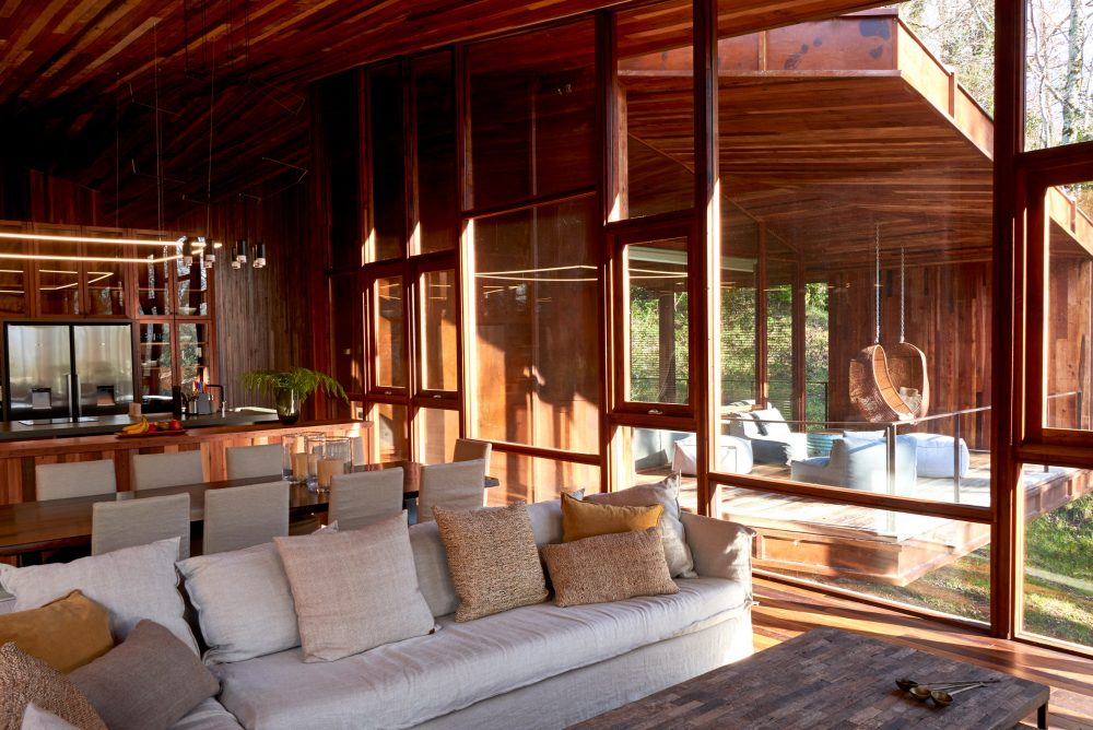 Dark, textured finishes characterise the interior surfaces and exterior cladding of Casa Lluvia and you’ll be bowled over by the contemporary finishes throughout this mesmerising property in Southern Chile. Weathering-steel panels cover the outside of the home in a striking vertical pattern and the metal was allowed to rust naturally, then sealed to maintain the desired finish. On the inside of the home, reclaimed woods from many different sources were used in order to achieve a rich and textured effect and make it a comfortable space for the family to spend time.