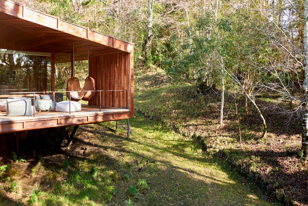The Casa Lluvia property from Equipo Cazu Zegers has a roof made from a nylon sheet which has been tensioned by threads, with a central pillar that allows the water run off the simple construction. Set atop angled stilts in the forest, Casa Lluvia was designed with the intention to deliver unparalleled views of, and resemble, the treescape that surrounds the property. This setup also creates sheltered spaces beneath the structure, designed for barbecuing and outdoor relaxation.
