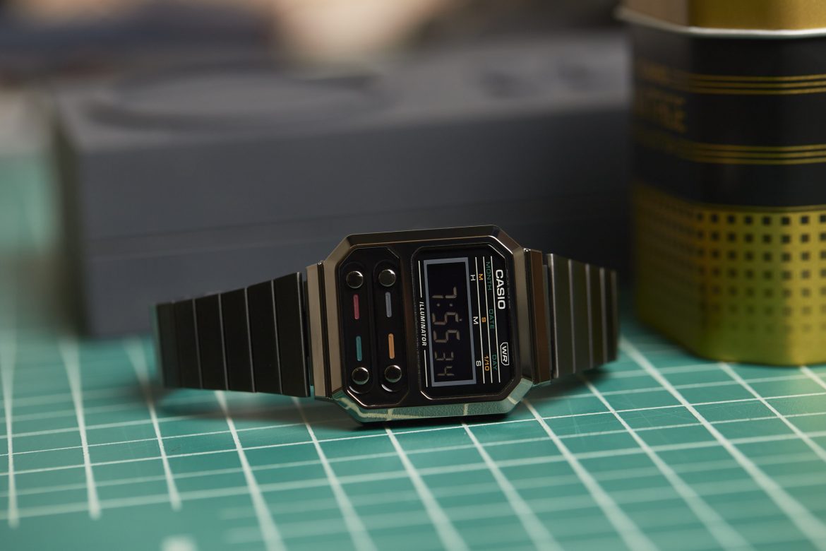 The Casio A100 Watch comes in three different colour choices – Black, Gold and Silver – and with prices starting at an unbelievably reasonable $54.95, you’ll get this effortlessly cool timepiece on your wrist without having to break the bank. In 1978 Casio first released the F-100, which was their first resin-cased watch. A small-scale digital watch, it boasted an off-centre display and top-mounted buttons, which provided it with a highly distinctive aesthetic. While seemingly ordinary and retro by today’s standards, at the time, this was a truly cutting-edge piece of technology and proved mighty popular.