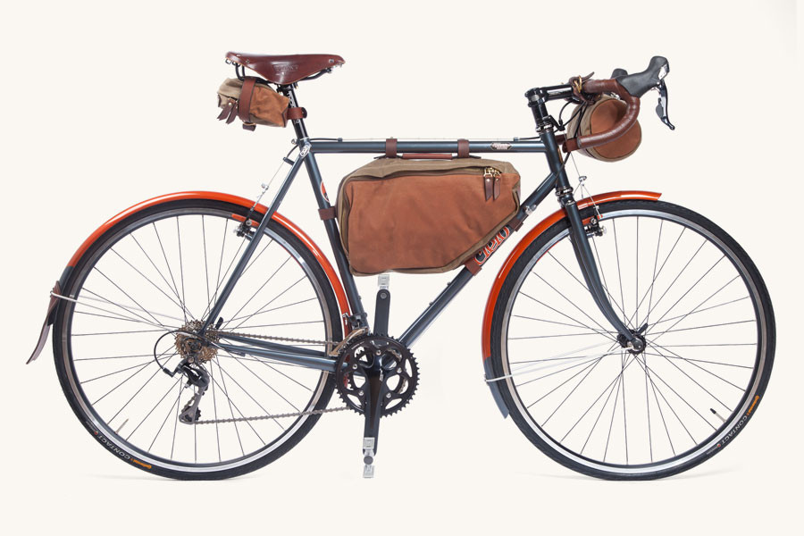 Tanner Goods version of the renowned Cielo bicycle pairs custom steel construction with a set of three waxed canvas bags. They suggest small necessities in the handlebar bag, bike tools in the saddlebag, and a picnic or other payload in the frame bag. I suggest not leaving this bike out in Portland’s rain. Check out a few shots of this cracking steed below: